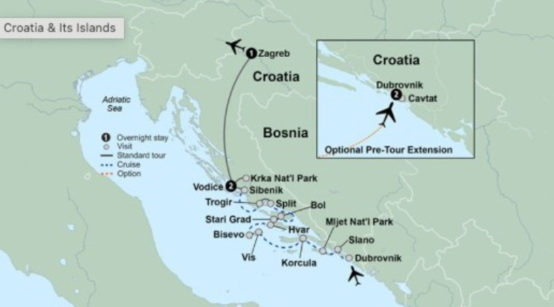 Dubrovnik, Slano, Korcula, Vis, Bisevo, Hvar, Stari Grad, Boi, Split, Trogir, Sibenik, Vodice, and Zagreb