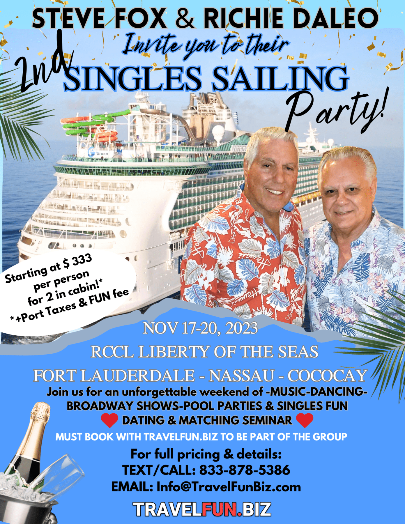 * MUST BOOK DIRECT WITH TRAVELFUN.BIZ to be part of the Steve Fox and Richie DAleo Singles Sailing group