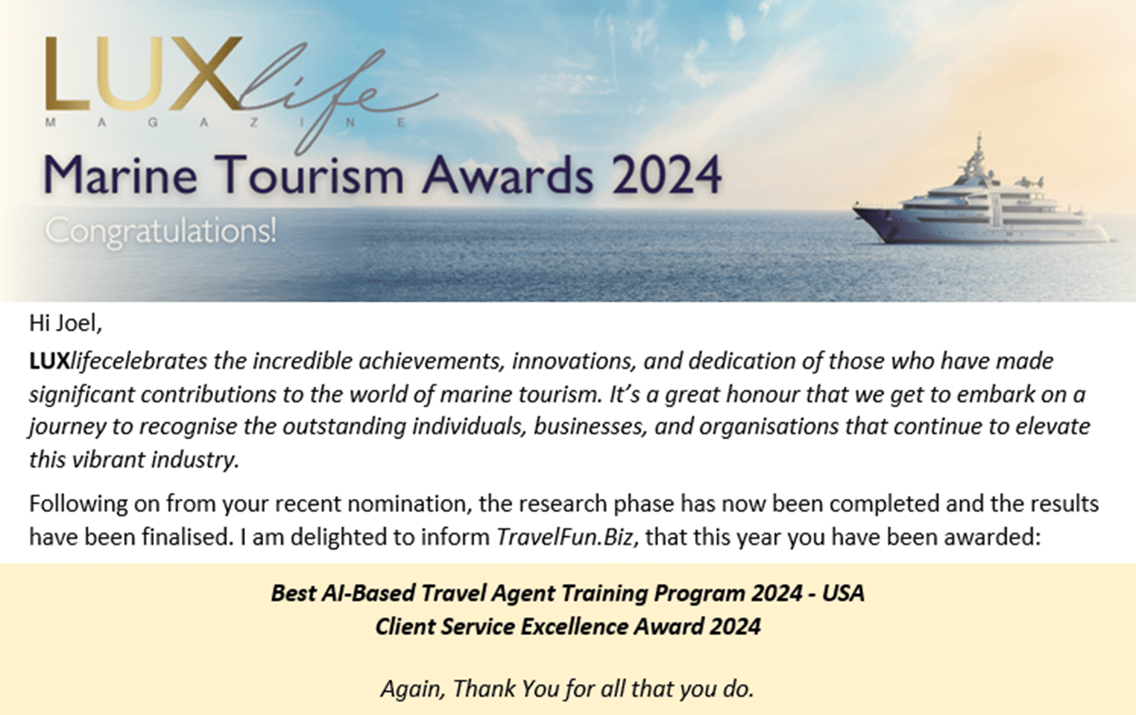 Boca Raton, FL – TravelFun.Biz is proud to announce that its CTO, Joel Frenette, has won the prestigious “Best AI-Based Travel Agent Training Program” category in the 2024 Marine Tourism Awards by LUXLife Magazine. This award highlights TravelFun.Biz’ s dedication to empowering travel agents with the latest tools, knowledge, and confidence needed to succeed in today’s fast-paced travel industry.