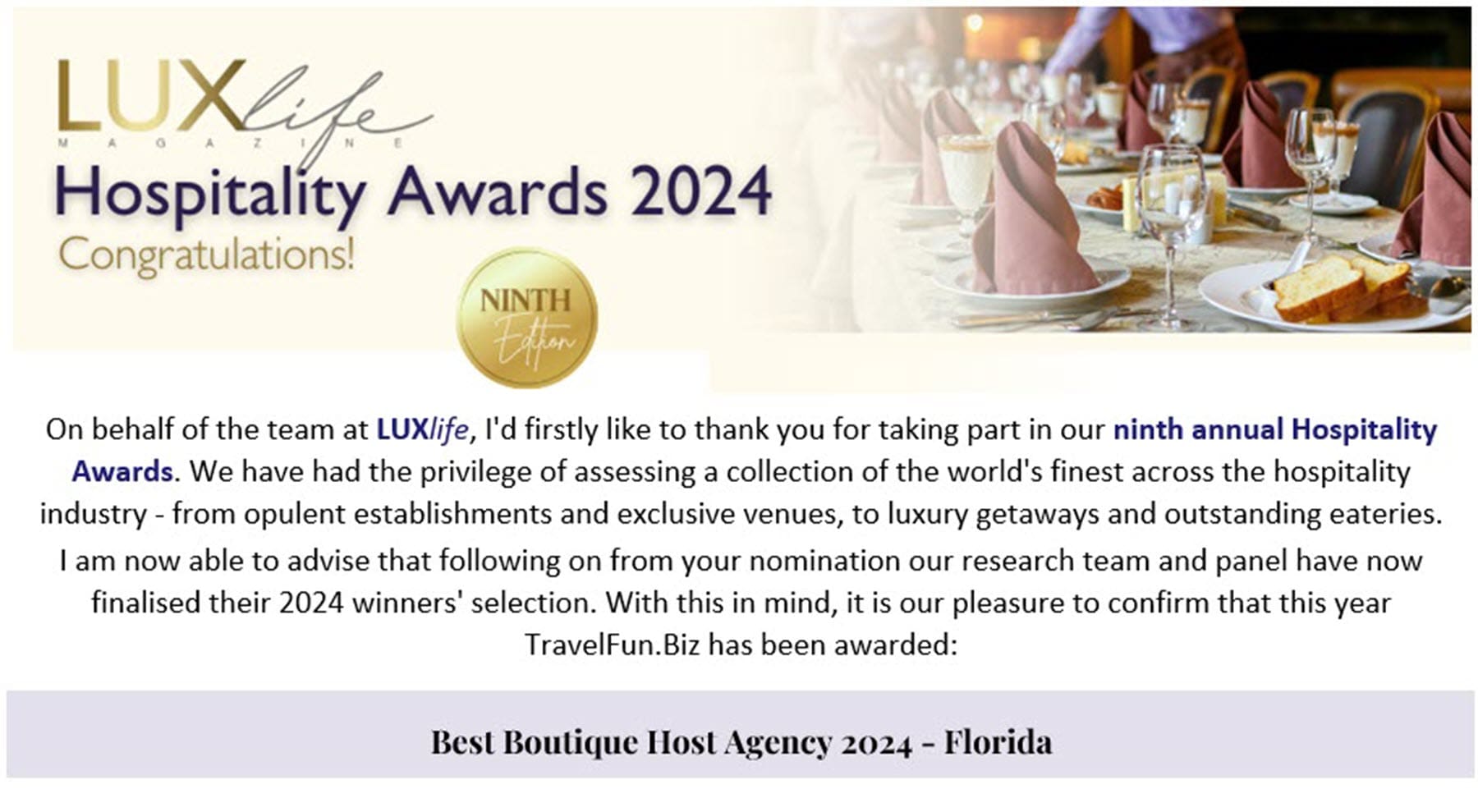 We are excited to announce that our host travel agency has been honored with the prestigious title of “Best Boutique Host Agency 2024 — Florida” by LUXlife in the ninth annual Hospitality Awards. This recognition is a testament to our commitment to excellence in the travel industry and a significant milestone in our journey as a boutique host agency.